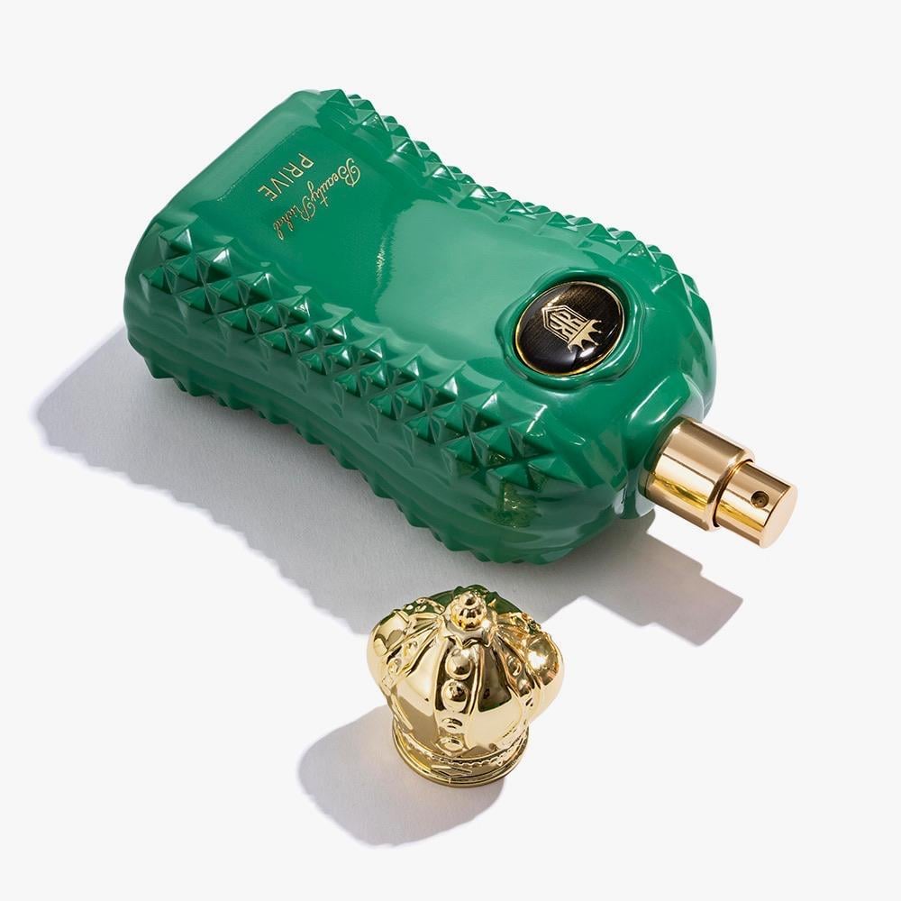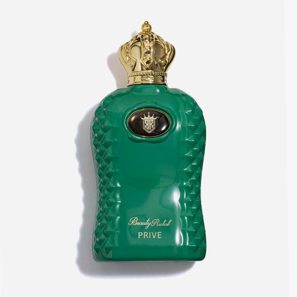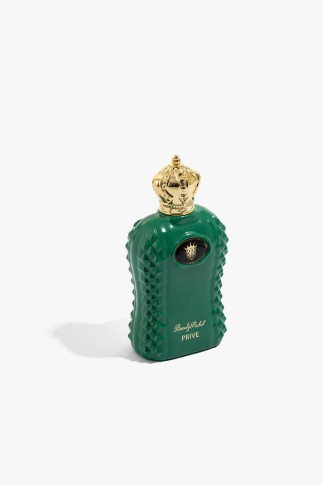 تأتي زجاجة عطر برايف بيوتي ريشال بحجم 100 مل، بتصميم فريد يجمع بين الأناقة والفخامة. الزجاجة ذات اللون الأخضر العميق تتميز بملمس مميز، حيث تتداخل الأشكال الهندسية بشكل أنيق، بينما تضيف القلادة الذهبية لمسة ملكية تجعلها تبرز في أي مجموعة عطور.